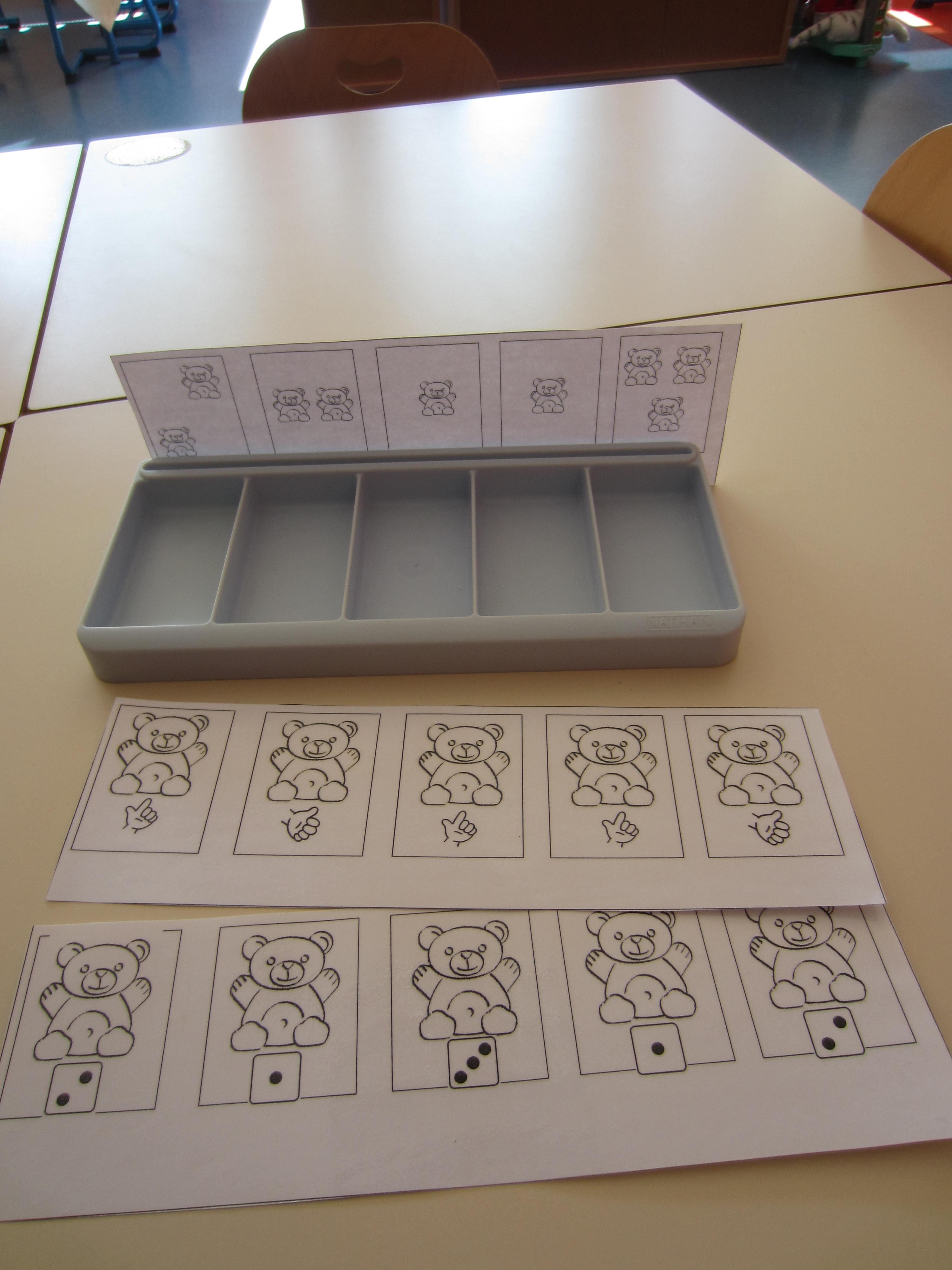 Je reconnais globalement une quantité et je replace le nombre d'ours demandé. Je reconnais les constellations (dé), les doigts et une petite quantité d'objets jusqu'à 3 et je sais donné la quantité correspondante.